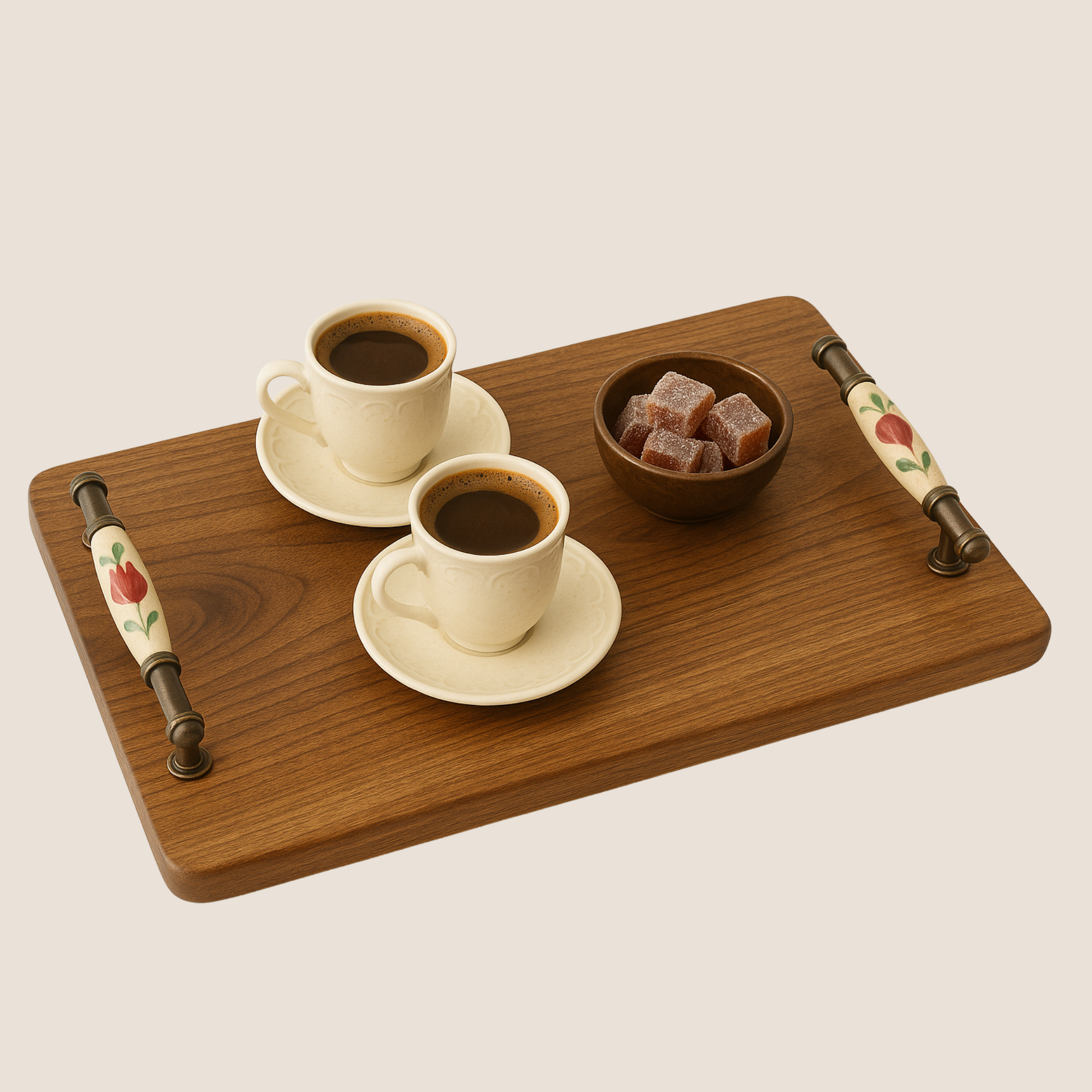 Doğal ceviz ağacından tamamen el işçiliğiyle üretilmiş bu şık sunum tepsisi, estetik ve fonksiyonelliği bir araya getiriyor. Özel olarak seçilen masif ceviz yüzey, her ürüne benzersiz bir doku kazandırırken; vintage desenli seramik kaplı metal kulplar taşıma kolaylığı sunar. Çay, kahve, tatlı veya ikram sunumlarınızda doğal ve sıcak bir ambiyans yaratmak isteyenler için ideal bir üründür.
